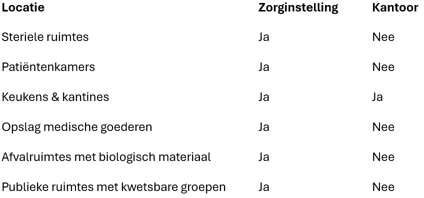 Zorginstellingen zijn complexer dan kantoren. Ze bestaan uit uiteenlopende ruimtes met elk hun eigen eisen: van operatiekamers tot patiëntenkamers, van keukens tot afvalruimtes. Elk van deze zones kent unieke risico’s voor plaagdieren.